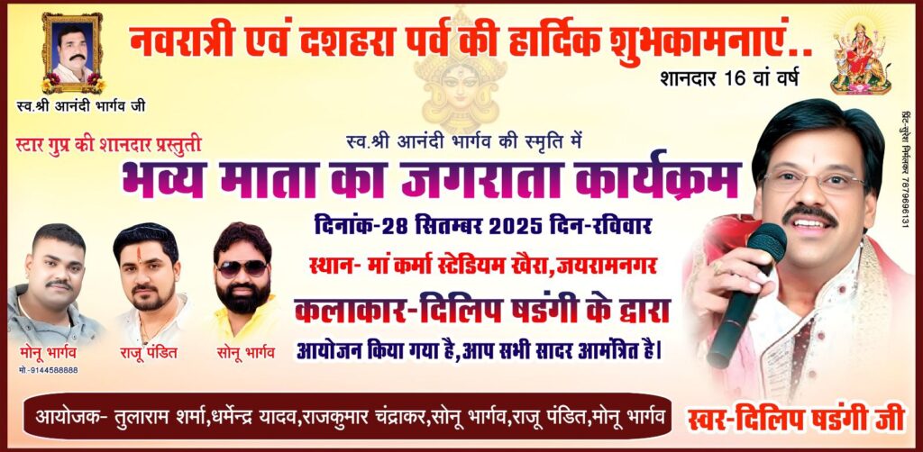 मस्तूरी।नवरात्रि पर्व के अवसर पर जगराता कार्यक्रम आयोजित किया जाएगा, जिसमें देवी की आराधना, भजन-कीर्तन और रंगारंग सांस्कृतिक प्रस्तुतियों के माध्यम से भक्तों को आध्यात्मिक और सांस्कृतिक आनंद प्रदान किया जाएगा।यह कार्यक्रम दिनांक 28सितम्बर दिन रविवार को समय:शाम 8बजे से स्थान मां कर्मा स्टेडियम खैरा, जयरामनगर में आयोजित होगा। कार्यक्रम में मुख्य अतिथि- दिलीप लहरिया (विधायक मस्तूरी) रहेंगे ठा. नितेश सिंह(उपाध्यक्ष जनपंद पंचायत मस्तूरी) करेंगे वहीं विशिष्ट अतिथि के रूप में राजू पंडित (सभापति जनपंद पंचायत मस्तूरी )देवेन्द्र कृष्णन (जनपद पंचायत सदस्य )भोलाराम साहू (ब्लॉक समन्यव कांग्रेस कमेटी मस्तूरी )दामोदर कांत (जिला पंचायत सदस्य ) एवं आमंत्रित अतिथिगण में धरम भार्गव, दयाशंकर राठौर देवेन्द्र शर्मा, बालमुकुंद वर्मा मुख्य रूप से उपस्थित रहेंगे। कार्यक्रम का आयोजक- तुलाराम शर्मा, धर्मेन्द्र यादव, राजकुमार चंद्राकर, सोनू भार्गव, राजू पंडित, मोनू भार्गव एवं समस्त स्टार ग्रुप खैरा, जयरामनगर कर रहे हैं।कार्यक्रम में देवी की आराधना और पूजा-अर्चना के साथ,भजन-कीर्तन और सांस्कृतिक कार्यक्रम, की रंगारंग प्रस्तुतियों के माध्यम से नवरात्रि की महिमा का प्रदर्शन,भक्तों के लिए प्रसाद की व्यवस्था की गई है। जिसमें