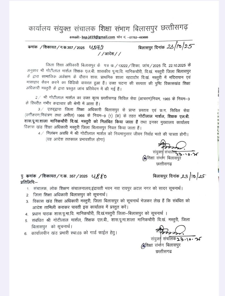 संयुक्त संचालक शिक्षा संभाग बिलासपुर ने शासकीय पूर्व माध्यमिक विद्यालय मानिकचौरी (विकासखंड मस्तूरी) के शिक्षक एल.बी. श्री गोटीलाल मार्शल को निलंबित कर दिया है।