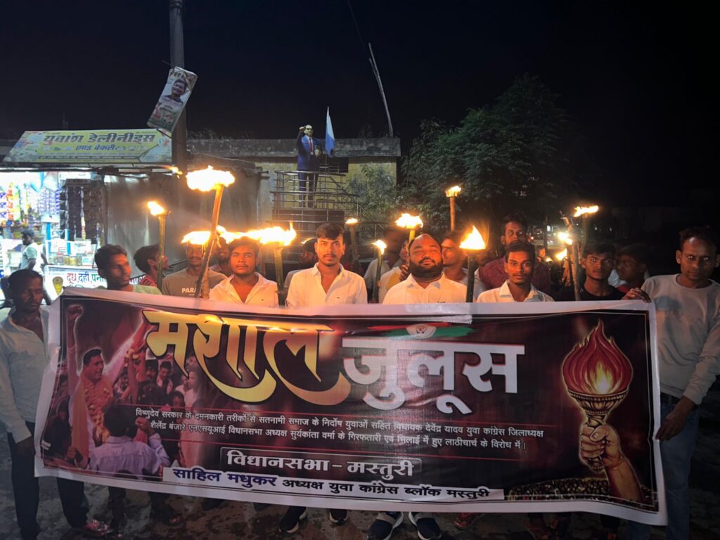 मस्तूरी। युवा कांग्रेस के कार्यकर्ताओं ने मशाल जुलूस निकाला मस्तूरी के अम्बेडकर चौक से शुरू होकर जोंधरा चौक पहुंची, जिसमें सैकड़ों युवा कांग्रेसी शामिल थे। अम्बेडकर चौक से जोंधरा चौक तक मस्तूरी थाना के पुलिसकर्मी तैनात रहे।मशाल जुलूस निकालकर युवा कांग्रेस ने कांग्रेस विधायक देवेन्द्र यादव के रिहायी की मांग की। साथ ही बलौदा बाजार में हुऐ आगजननी में सतनामी समाज के निर्दोष लोगों को साजिस पुर्वाक भाजपा सरकार के द्वारा झुठा केस दर्ज कर जेल दाखिल करने पर विरोध प्रदर्शन कर नारा बाजी करते हुए मशाल जुलूस निकाला,