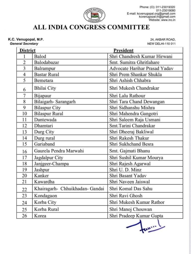 नई सूची के अनुसार, रायपुर सिटी का जिम्मा श्रीकुमार शंकर मेनन को दिया गया है, जबकि रायपुर ग्रामीण के जिलाध्यक्ष राजेंद्र पप्पू बंजारे बनाए गए हैं।