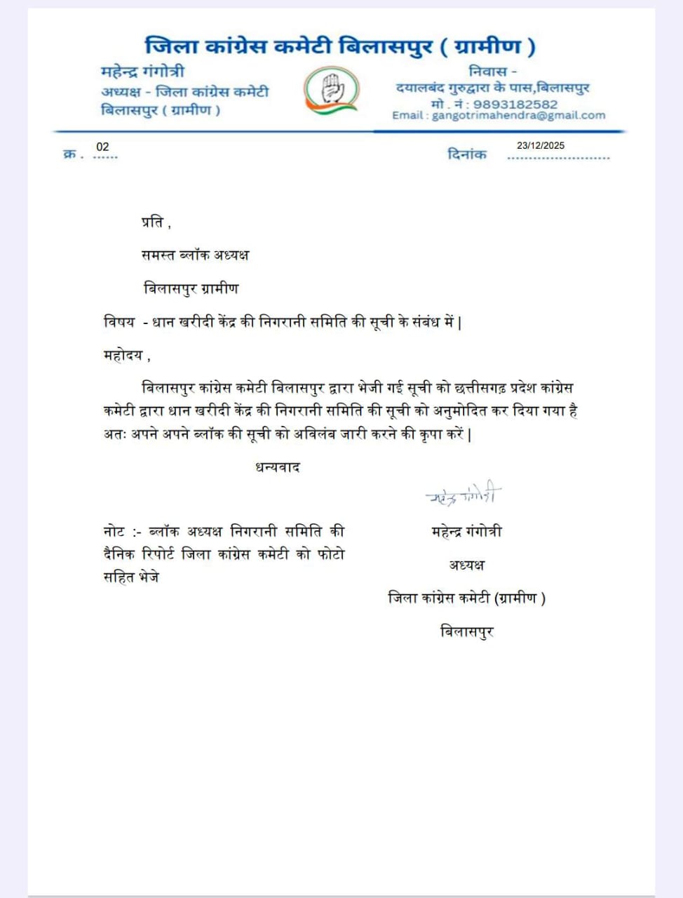 बिलासपुर ग्रामीण क्षेत्र में धान खरीदी व्यवस्था को पारदर्शी और प्रभावी बनाने की दिशा में अहम कदम उठाया गया है। बिलासपुर जिला कांग्रेस कमेटी द्वारा प्रस्तावित धान खरीदी केंद्रों की निगरानी समिति की सूची को छत्तीसगढ़ प्रदेश कांग्रेस कमेटी ने अनुमोदन प्रदान कर दिया है।