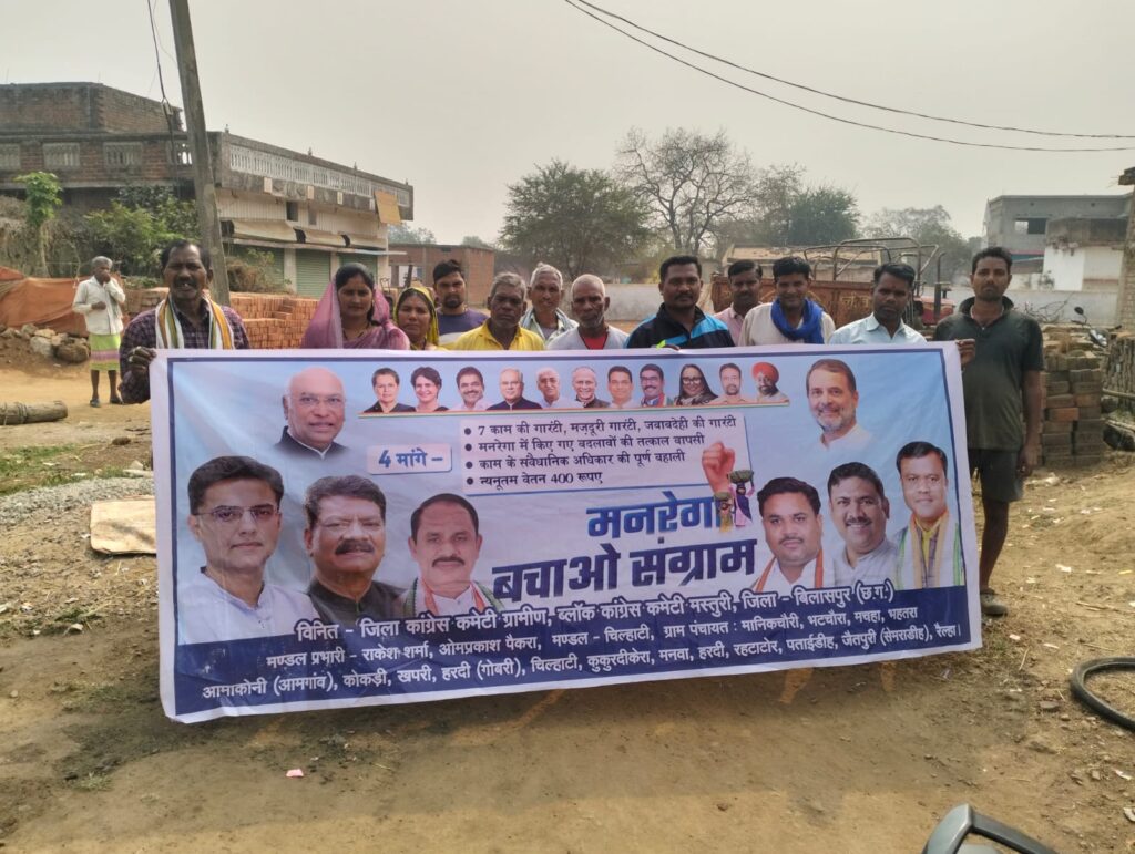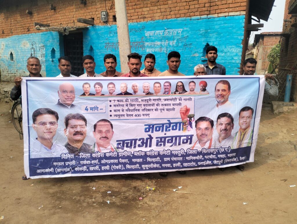 मस्तूरी। मस्तूरी विधानसभा क्षेत्र के अंतर्गत चिल्हाटी में मनरेगा बचाओ संग्राम रैली का आयोजन किया गया। रैली का नेतृत्व चिल्हाटी मंडल अध्यक्ष देवेंद्र पटेल ने किया। यह रैली ग्राम पंचायत मानिकचौरी से प्रारंभ होकर भटचौरा, बहतरा और आमगांव तक निकाली गई।रैली में मनरेगा योजना को मजबूत करने तथा मजदूरों के अधिकारों की रक्षा की मांग की गई। इस दौरान बड़ी संख्या में ग्रामीण, मजदूर एवं कार्यकर्ता उपस्थित रहे।