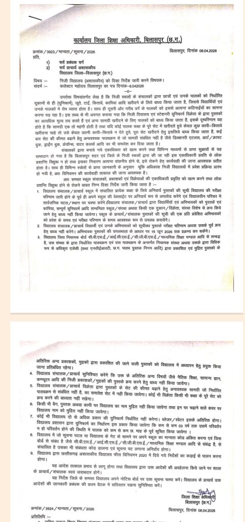 बिलासपुर। जिले में निजी (अशासकीय) स्कूलों द्वारा किताबों, कॉपियों और अन्य शैक्षणिक सामग्री की जबरन बिक्री को लेकर जिला शिक्षा अधिकारी ने सख्त रुख अपनाया है। जारी आदेश में स्पष्ट किया गया है कि अब कोई भी स्कूल छात्रों या उनके पालकों को किसी एक निर्धारित दुकान से सामग्री खरीदने के लिए बाध्य नहीं कर सकेगा।दरअसल, पिछले कुछ समय से लगातार शिकायतें मिल रही थीं कि कई निजी स्कूल अपने निर्धारित दुकानों के माध्यम से महंगी किताबें, कॉपियां और अन्य सामग्री खरीदने के लिए दबाव बना रहे थे। इससे पालकों पर अतिरिक्त आर्थिक बोझ पड़ रहा था। इन शिकायतों को गंभीरता से लेते हुए जिला शिक्षा अधिकारी ने यह सख्त निर्देश जारी किया है।आदेश के अनुसार, सभी स्कूलों को केवल निर्धारित पाठ्यक्रम जैसे NCERT/SCERT की पुस्तकों को ही प्राथमिकता देनी होगी। साथ ही स्कूल परिसर में किसी भी प्रकार की किताब या कॉपी की बिक्री पूरी तरह प्रतिबंधित कर दी गई है। प्रत्येक विद्यालय को अपनी पुस्तक सूची स्कूल के नोटिस बोर्ड एवं वेबसाइट पर सार्वजनिक करना अनिवार्य किया गया है, ताकि पालकों को पारदर्शिता के साथ जानकारी मिल सके।इसके अलावा, स्कूल प्रबंधन द्वारा अनावश्यक गाइड, प्राइवेट प्रकाशनों की महंगी किताबें या अन्य सामग्री खरीदने के लिए छात्रों को बाध्य नहीं किया जा सकेगा। किसी भी पुस्तक या कॉपी पर स्कूल का नाम छपवाना भी अनिवार्य नहीं रहेगा। सत्र के बीच में किताबें या पाठ्यक्रम बदलने पर भी पूरी तरह रोक लगा दी गई है।