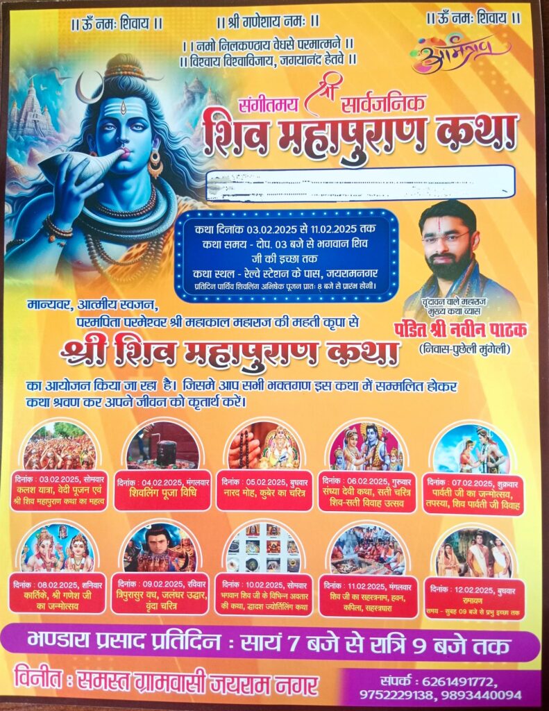 मस्तूरी। मुख्यालय के ग्राम पंचायत जयरामनगर में रेलवे स्टेशन के पास संगीत में शिव महापुराण कथा का आयोजन किया जा रहा है, जिसमें वृंदावन वाले महाराज मुख्य कथा व्यास पंडित श्री नवीन पाठक जी के द्वारा कथा का रसपान कराया जाएगा, यह कथा 3 फरवरी से प्रारंभ होकर 11 फरवरी तक चलेगी समय दोपहर 3:00 बजे से रखा गया है जिसमें 3 फरवरी को कलश यात्रा वेदी पूजन, 4 फरवरी को शिवलिंग पूजा विधि, 5 फरवरी को नारद मोह कुबेर का चरित्र, 6 फरवरी को संध्या देवी कथा, सती चरित्र, शिव सती विवाह उत्सव, 7 फरवरी को पार्वती जी का जन्म उत्सव, तपस्या, शिव पार्वती जी विवाह, 8 फरवरी को कार्तिकेय श्री गणेश जी के जन्मोत्सव, 9 फरवरी त्रिपुरा सुर वध, जालंधर उध्धार, वृंदा चरित्र, 10 फरवरी को भगवान शिव जी के विभिन्न अवतार की कथा द्वादश ज्योतिर्लिंग कथा, 11 फरवरी को शिव जी का सहस्त्रनाम हवन कपिला सहस्त्रधारा, के आयोजन के साथ सभी भक्तगण इस कथा में सम्मिलित होकर कथा श्रवण कर अपने जीवन को कृतार्थ करेंगे। 12 फरवरी को रामायण का भी आयोजन सुबह 9:00 से किया जाएगा। और प्रतिदिन भंडारा प्रसाद वितरण शाम 7:00 बजे से रात्रि 9:00 बजे तक रखा गया है। आयोजन की तैयारी में उमाशंकर राठौर, विवेक शर्मा, डॉ. समीर चंद्राकर एवं प्रिंशू थवाईत लगे हुए हैं, जिसकी तैयारी लगभग पूर्ण कर ली गई है।