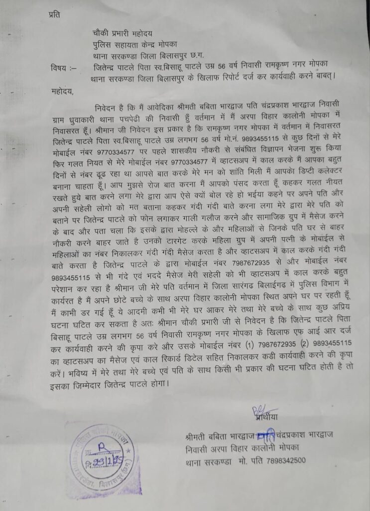 बिलासपुर।आवेदिका के अनुसार मोपका पुलिस सहायता केंद्र में आवेदन दिया है कि रामकृष्ण नगर मोपका में वर्तमान में निवासरत जितेन्द्र पाटले पिता स्व.बिसाहू पाटले उम्र लगभग 56 वर्ष मो.नं. 9893455115 से कुछ दिनों से उनके मोबाईल नंबर 9770334577 पर पहले शासकीय नौकरी से संबंधित विज्ञापन भेजना शुरू किया फिर गलत नियत से उनके मोबाईल नंबर 9770334577 में व्हाटसअप में काल करके मैं आपका बहुत दिनों से नंबर ढूंढ रहा था आपसे बात करके मेरे मन को शांति मिलती है,मैं आपको डिप्टी कलेक्टर बनाना चाहता हूँ। आप मुझसे रोज बात करना मैं आपको पंसद करता हूँ कहकर गलत नीयत रखते हुये बात करने लगा, और प्रार्थी के द्वारा आप ऐसे क्यों बोल रहे हो भईया कहने पर अपने पति और अपनी सहेली लोगो को मत बताना कहकर गंदी गंदी बाते करना लगा प्राथी के द्वारा मेरे पति को बताने पर जितेन्द्र पाटले को फोन लगाकर गाली गलौज करने और सामाजिक ग्रुप में मैसेज करने के बाद और पता चला कि इसके द्वारा मोहल्ले के और महिलाओं से जिनके पति घर से बाहर नौकरी करने बाहर जाते है उनको टारगेट करके महिला ग्रुप में अपनी पत्नी के मोबाईल से महिलाओं का नंबर निकालकर गंदी गंदी मैसेज करता है और व्हाटसअप में काल करके गंदी गंदी बाते करता है जितेन्द्र पाटले के द्वारा मोबाईल नंबर 7987672935 से और मोबाईल नंबर 9893455115 से भी गंदे एवं भददे मैसेज उनकी सहेली को भी व्हाटसअप में काल करके बहुत परेशान किया गया है, प्राथिया ने बताया कि उनके पति वर्तमान में जिला सारंगढ बिलाईगढ में पुलिस विभाग में कार्यरत है, और अपने छोटे बच्चे के साथ अरपा विहार कालोनी मोपका स्थित अपने घर पर रहती है ,और वो डर गई है कि ये आदमी कभी भी उनके घर आकर उनके साथ तथा उनके बच्चे के साथ कुछ अप्रिय घटना घटित कर सकता है,जिस कारण उन्होंने चौकी प्रभारी मोपका से लिखित में शिकायत किया है कि जितेन्द्र पाटले पिता बिसाहू पाटले उम्र लगभग 56 वर्ष निवासी रामकृष्ण नगर मोपका के खिलाफ एफ आई आर दर्ज कर उचित कार्यवाही करें और उसके मोबाईल नंबर (1) 7987672935 (2) 9893455115 का व्हाटसअप का मैसेज एवं काल रिकार्ड डिटेल सहित निकालकर जांच करते हुए कड़ी कार्यवाही करें।ताकी भविष्य में प्राथी तथा उनके बच्चे एवं पति के साथ किसी भी प्रकार की घटना घटित न हो,और अगर होती है तो उनके जिम्मेदार जितेन्द्र पाटले होगा।