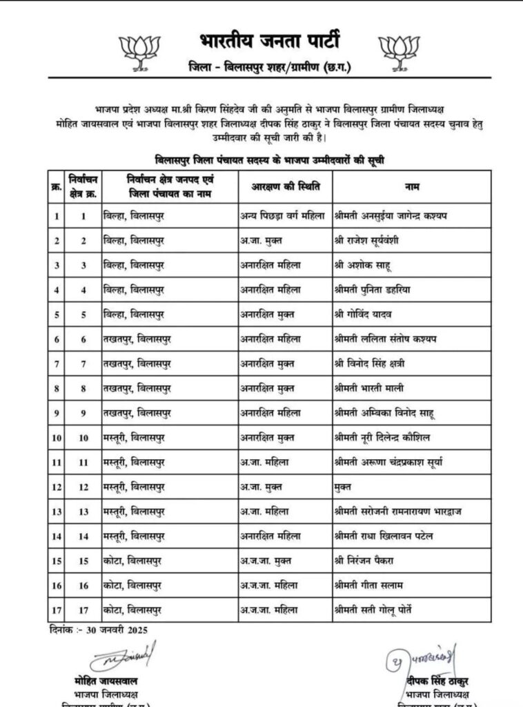 बिलासपुर।त्रिस्तरीय पंचायत चुनाव में भारतीय जनता पार्टी के जिला पंचायत सदस्य के पद पर में लड़ने वाले जिला सदस्यों की सूची जारी की है जिसमें मस्तूरी के क्षेत्र क्रमांक 12 में जिला पंचायत के कोई भी पदाधिकारी को चिन्हांकित नहीं किया गया है, बल्कि उसको मुक्त कर दिया गया है ,जिसमें भाजपा के कोई भी कार्यकर्ता प्रत्याशी के रूप में अपना दांव आजमा सकते हैं, देख सूची किसको कहां से मिला है मौका…..