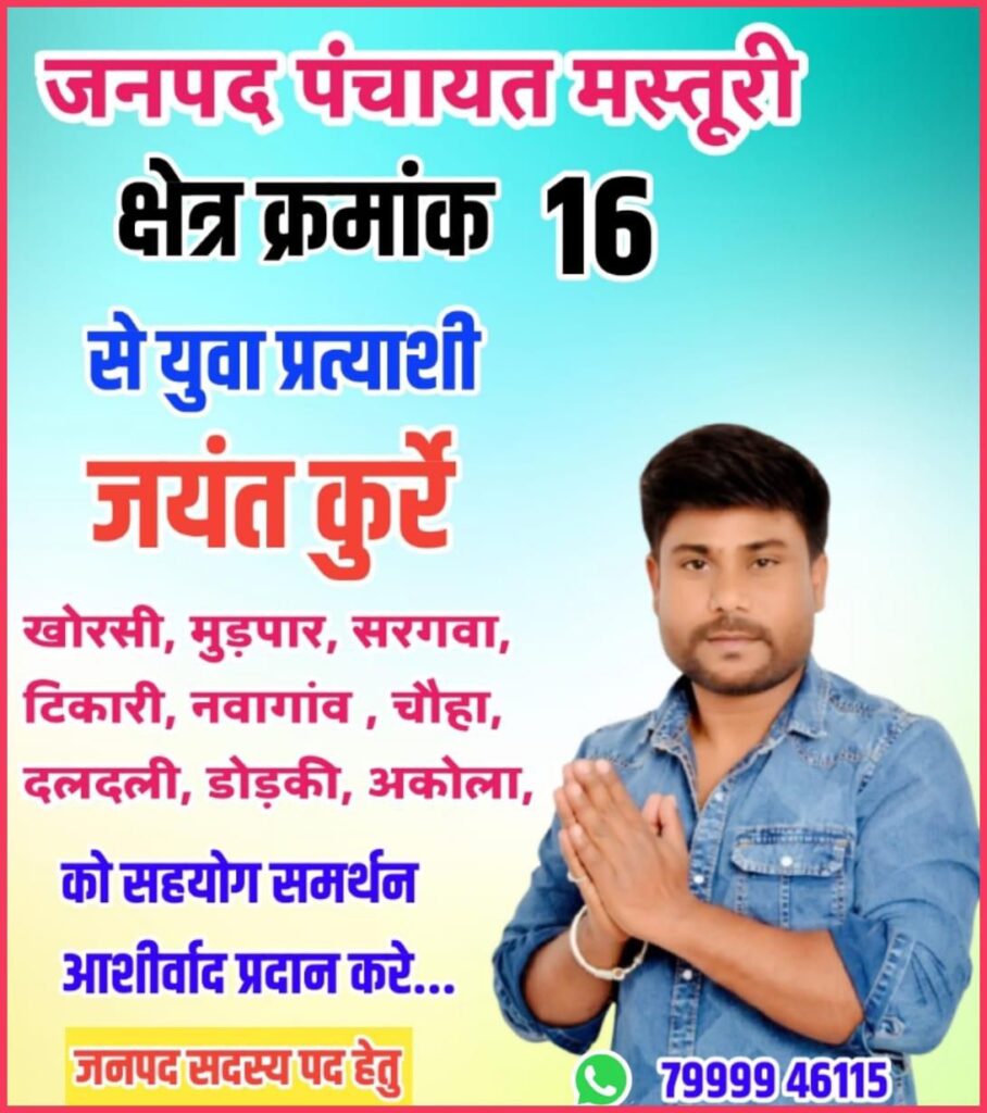 मस्तूरी। जनपद पंचायत के सदस्य पद के लिए क्षेत्र क्रमांक 16 से युवा प्रत्याशी जयंत कुर्रे ने अपना नामांकन आज भरा है , जिसमें खोरसी, मुड़पार, सरगवा, टिकारी, नवागांव, चौहा, दलदली, डोड़की, अकोला, क्षेत्र से जनपद सदस्य के लिए वे चुनाव लड़ रहे हैं, जयंत कुर्रे छात्र संघ के राजनीतिक से अपनी राजनीतिक की शुरुआत किए हैं युवाओं में अच्छी पकड़ होने के कारण उन्हें लोगों का सहयोग समर्थन आशीर्वाद मिल रहा. और निश्चित ही युवा लड़के के राजनीतिक में आने से क्षेत्र में बदलाव की लहर भी चल रही है।
