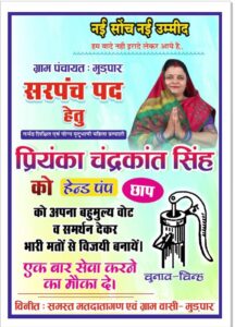 मस्तूरी। जनपद पंचायत क्षेत्र के ग्राम पंचायत मुड़पार में सरपंच पद के लिए कुल आठ उम्मीदवार है, जिसमें से हेड पंप छाप पर खड़ी प्रियंका चंद्रकांत सिंह को भारी जन समर्थन मिल रहा है, ग्राम पंचायत मुड़पार के प्रथम सरपंच रहे, चंद्रकांत सिंह के ग्राम वासियों में अच्छी लगाओ एवं मृदुभाषी स्वभाव के साथ-साथ उनकी राजनीतिक एवं प्रशासनिक अच्छी पकड़ होने का फायदा, सरपंच पद के प्रत्याशी उनकी धर्मपत्नी श्रीमती प्रियंका सिंह को मिल रही है।