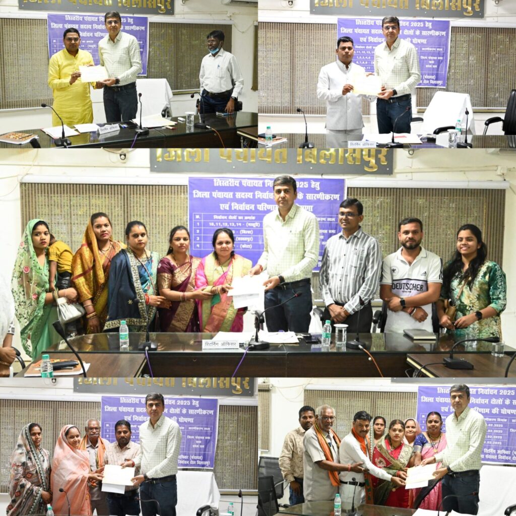 बिलासपुर। त्रिस्तरीय पंचायत निर्वाचन 2025 के तहत जिला पंचायत सदस्यों हेतु प्रथम चरण में मस्तूरी निर्वाचन क्षेत्र क्रमांक 10 से 14 में 17 फरवरी 2025 को हुए चुनाव के बाद सारणीकरण एवं परिणाम की घोषणा जिला पंचायत सभाकक्ष के प्रथम तल में की गई। सारणीकरण का कार्य जिला पंचायत के रिटर्निंग ऑफिसर संदीप कुमार अग्रवाल तथा सहायक रिटर्निंग ऑफिसर मनीष साहू एवं श्रीमती शिवानी सिंह की उपस्थिति में संपन्न हुआ। जिला पंचायत निर्वाचन क्षेत्र क्रमांक 10 से राजेन्द्र धीवर ने 11103 मत प्राप्त कर अपने निकटतम प्रतिद्वंदी नंदनी पवन साहू पर 2278 वोटो से जीत दर्ज की, इसी प्रकार क्षेत्र क्रमांक 11 से अरूना चन्द्रप्रकाश सूर्या ने 12946 वोट प्राप्त कर अपने निकटतम प्रतिद्वंदी अंजली राजू सूर्यवंशी को 5588 वोटो से हराया। क्षेत्र क्रमांक 12 में दामोदर कांत ने 6664 मत प्राप्त कर एस कुमार मनहर से 899 वोटो की बढ़त प्राप्त की। क्षेत्र क्रमांक 13 से सतकली बावरे ने 9580 मत प्राप्त कर निकटतम प्रतिद्वंदी भगवती सुरेश खटकर को 1788 वोटो से हराया। निर्वाचन क्षेत्र क्रमांक 14 से श्रीमती राधा खिलावन पटेल ने 15916 मत प्राप्त कर अपनी निकटतम प्रतिद्वंदी सोनल मयंक साहू से 7295 वोटो से जीत दर्ज की। जिला पंचायत सदस्य के लिए नवनिर्वाचित प्रतिनिधियों को रिटर्निंग ऑफिसर संदीप कुमार अग्रवाल द्वारा प्रमाण पत्र प्रदान किया गया।