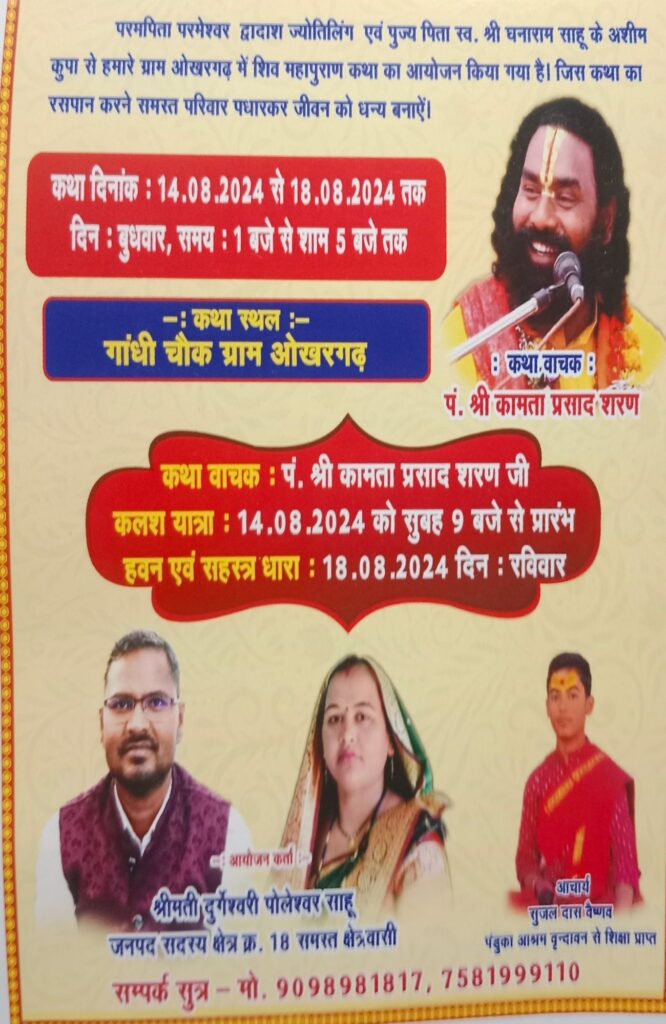 मस्तूरी । जनपद क्षेत्र के ग्राम पंचायत ओखर में शिव महापुराण पांच दिवसीय कथा का आयोजन क्षेत्र के जनपद सदस्य दुर्गेश्वरी पोलेश्वर साहू के द्वारा आयोजन किया जा रहा है, जिसमें कथा वाचक के रूप में प्रसिद्ध कीर्तनकार पंडित कामता प्रसाद शरण के मुख से शिव कथा सुनने को मिलेगा। 14 अगस्त से 18 अगस्त तक चलने वाले शिव महापुराण कथा का समय दोपहर 1:00 से शाम 5:00 बजे तक रखा गया है कार्यक्रम स्थल ग्राम पंचायत ओखर के गांधी चौक के पास होने वाले हैं। साहू परिवार द्वारा आयोजित इस शिव महापुराण की तैयारी जोरों से चल रही है।
