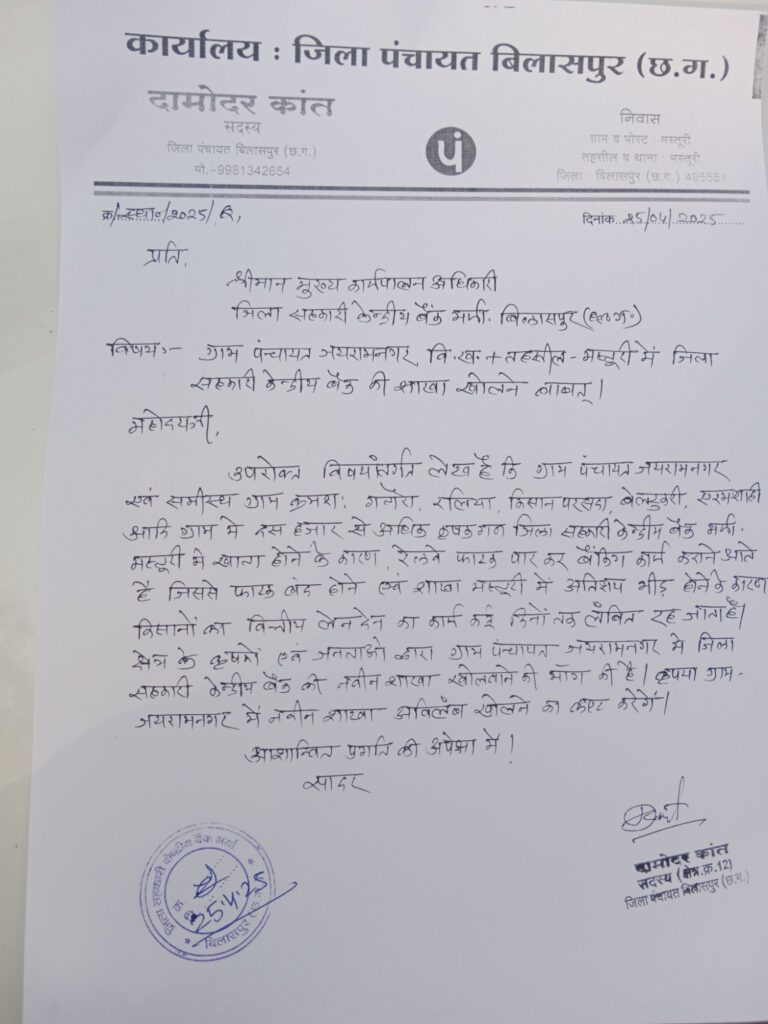 मस्तूरी। जयरामनगर परिक्षेत्र के हजारों कृषकों का जिला सहकारी केंद्रीय बैंक मस्तूरी में खाता होने के कारण रेलवे फाटक पार कर बैंकिंग कार्य करने आते हैं, जिससे फाटक बंद होने एवं शाखा मस्तूरी में अत्यधिक भिड़ भाड़ होने के कारण किसानों का वित्तीय लेनदेन का कार्य कई दिनों तक लंबित रह जाता है, क्षेत्र के कृषकों एवं ग्रामीणों द्वारा ग्राम पंचायत जयरामनगर में जिला सहकारी केंद्रीय बैंक की नवीन शाखा खोलने की मांग लगातार क्षेत्रीय जनप्रतिनिधियों से भी किया जा रहा था, जिसको संज्ञान में लेते हुए मस्तूरी के जिला पंचायत सदस्य दामोदर कांत ने प्रमुखता से लेते हुए आज जिला सहकारी केंद्रीय बैंक के मुख्य कार्यपालन अधिकारी से सौजन्य मुलाकात कर किसानों की समस्याओं से अवगत कराते हुए उन्हें लिखित में ज्ञापन सौपा है, जिससे जयरामनगर परिक्षेत्र के हजारों किसानों को नए बैंक मिलने से लाभ और सहूलिया मिल सके।
