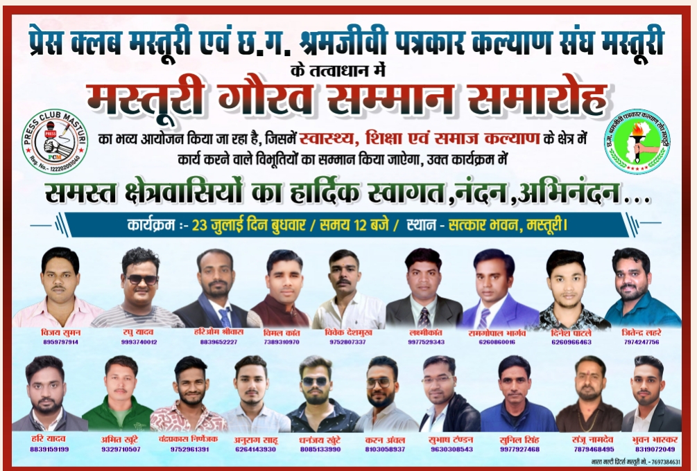 मस्तूरी। प्रेस क्लब मस्तूरी एवं छत्तीसगढ़ श्रमजीवी पत्रकार कल्याण संघ के तत्वधान में पहली बार मस्तूरी क्षेत्र में मस्तूरी गौरव सम्मान का आयोजन किया जा रहा है, जिसमें मस्तूरी क्षेत्र में शिक्षा, स्वास्थ्य और समाज कल्याण में अपना योगदान देने वाले विभूतियों का सम्मान किया जाएगा, साथ ही शहीद परिवार,खेल, कृषि, व बोर्ड परीक्षा में सबसे अधिक अंक लाकर उत्तीर्ण हुए छात्र-छात्राओं क भी सम्मान करने की तैयारी जोरो से चल रही है, इस कार्यक्रम में क्षेत्रीय विधायक के साथ-साथ जनपद एवं जिला की जनप्रतिनिधि व प्रशासनिक अधिकारी भी शामिल होंगे और उन्हीं के हाथों इन विभूतियों का सम्मान भी किया जाएगा। यह कार्यक्रम 23 जुलाई दिन बुधवार को दोपहर 12:00 से शाम 4:00 बजे तक रहेगा।