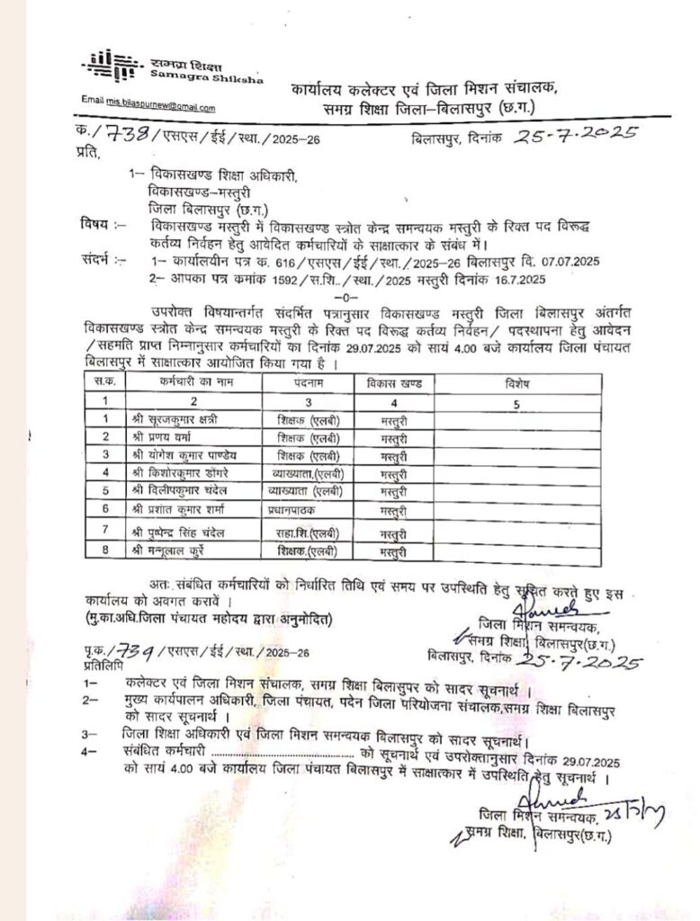 बिलासपुर। मस्तूरी में विकासखण्ड स्त्रोत केन्द्र समन्वयक मस्तुरी (बीआरसी)के रिक्त पद के लिए ऐसे भी कुछ कर्मचारी है जो आवेदन जमा कर पात्र के श्रेणी में है जो अपने कार्यों में लापरवाही करने के नाम से निलंबित भी हो चुके हैं। लेकिन अपनी राजनीतिक पकड़ और विभागीय अधिकारियों से साथ गांठ कर मस्तूरी बीआरसी बनने का सपना देख रहे हैं, बताते चलें कि मस्तूरी में अभी विकासखण्ड स्त्रोत केन्द्र समन्वयक (बीआरसी)का पद रिक्त हैं, जिसके लिए विभाग ने आवेदन मांगे थे, जिसमें मस्तूरी से कुल आठ कर्मचारीयों का पात्र सूची में नाम आया है,आवेदन करने वाले कर्मचारियों का दिनांक 29.07.2025 को सायं 4.00 बजे कार्यालय जिला पंचायत बिलासपुर में साक्षात्कार आयोजित किया भी जाना है।इन्हीं में से किसी एक कर्मचारी का चयन होना है।अब सवाल यह है की इन आठ लोगों में से ऐसे कई कर्मचारी है जो अपने कार्यों में लापरवाही के चलते निलंबित भी हो चुके हैं,और अब ऐसे में अगर विकासखण्ड स्त्रोत केन्द्र समन्वयक की प्रभार लापरवाह कर्मचारियों को मिलता है तो मस्तूरी क्षेत्र के शिक्षा और विकास में भारी लापरवाही और कमीशनखोरी हावी हो जाएगी। मस्तूरी विकासखंड क्षेत्र में विद्यालयों की स्थिति ऐसी भी जर्जर और बदहाल है, कहीं जगह बच्चों को पढ़ाई करने में छत नहीं मिल रहा है,तो कहीं बैठने के लिए टेबल कुर्सी भी उपलब्ध नहीं है, खेल मैदान से लेकर खेलने के सामग्री तक, मध्यान भोजन से लेकर पीने के पानी तक की समस्याएं आए दिन मस्तूरी विकासखंड के कई स्कूलों में देखने को मिलती रहती है, अब ऐसे में अगर गैरजिम्मेदार कर्मचारी को अगर बीआरसी का पद मिलता है तो फिर राम जाने मस्तूरी क्षेत्र में क्षेत्र में शिक्षा व विकास की स्थिति क्या होगी।